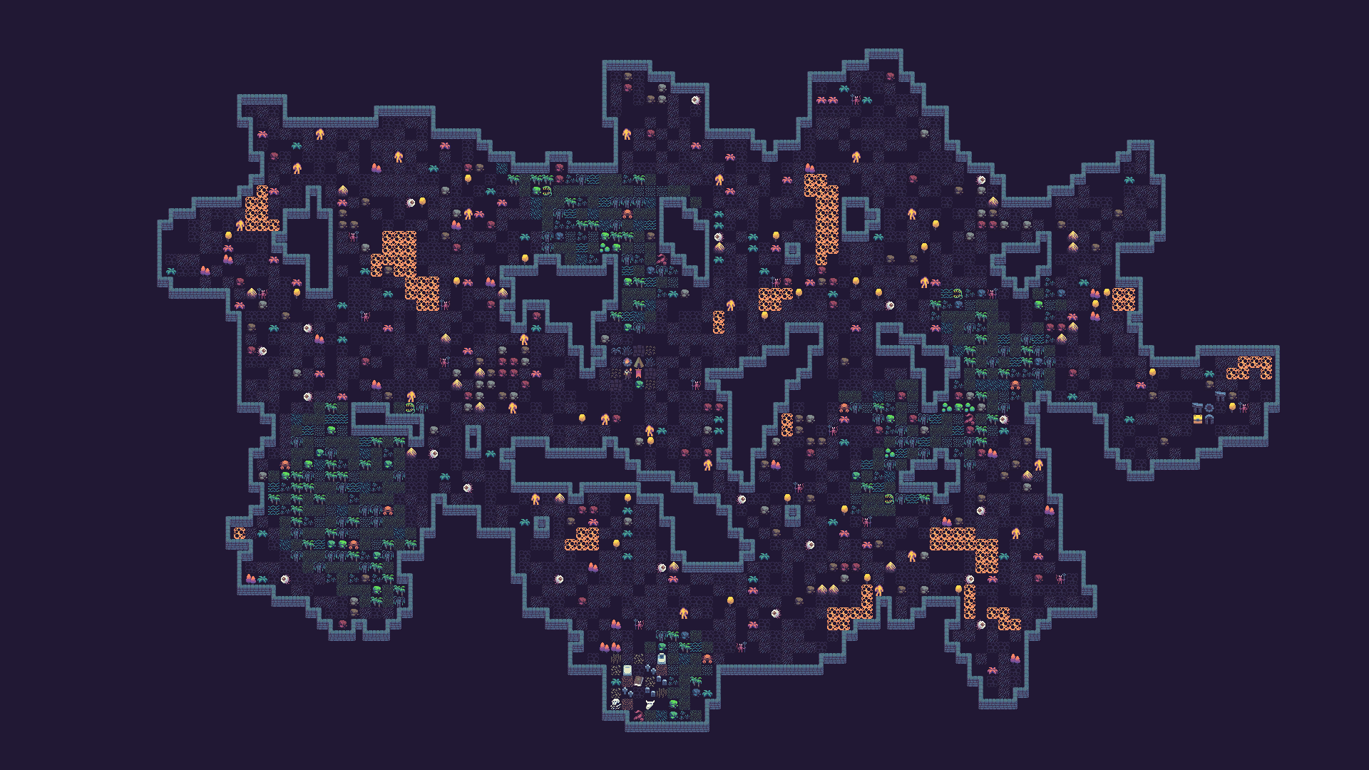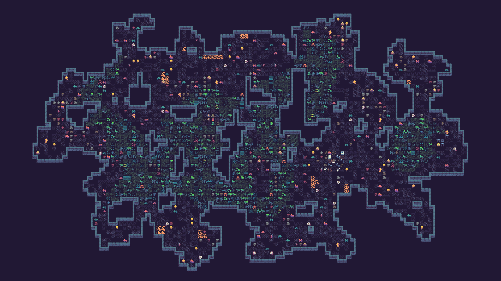 Next, we can place some enemies, vegetation and rocks. Vegetation is placed based on probability. Enemies are placed with a minimum distance of 5 tiles between them and a spawn probability. Rocks are placed based on probability as well, but there is another rule that places them based on a simplex noise value, creating chunks of rocks in some places.