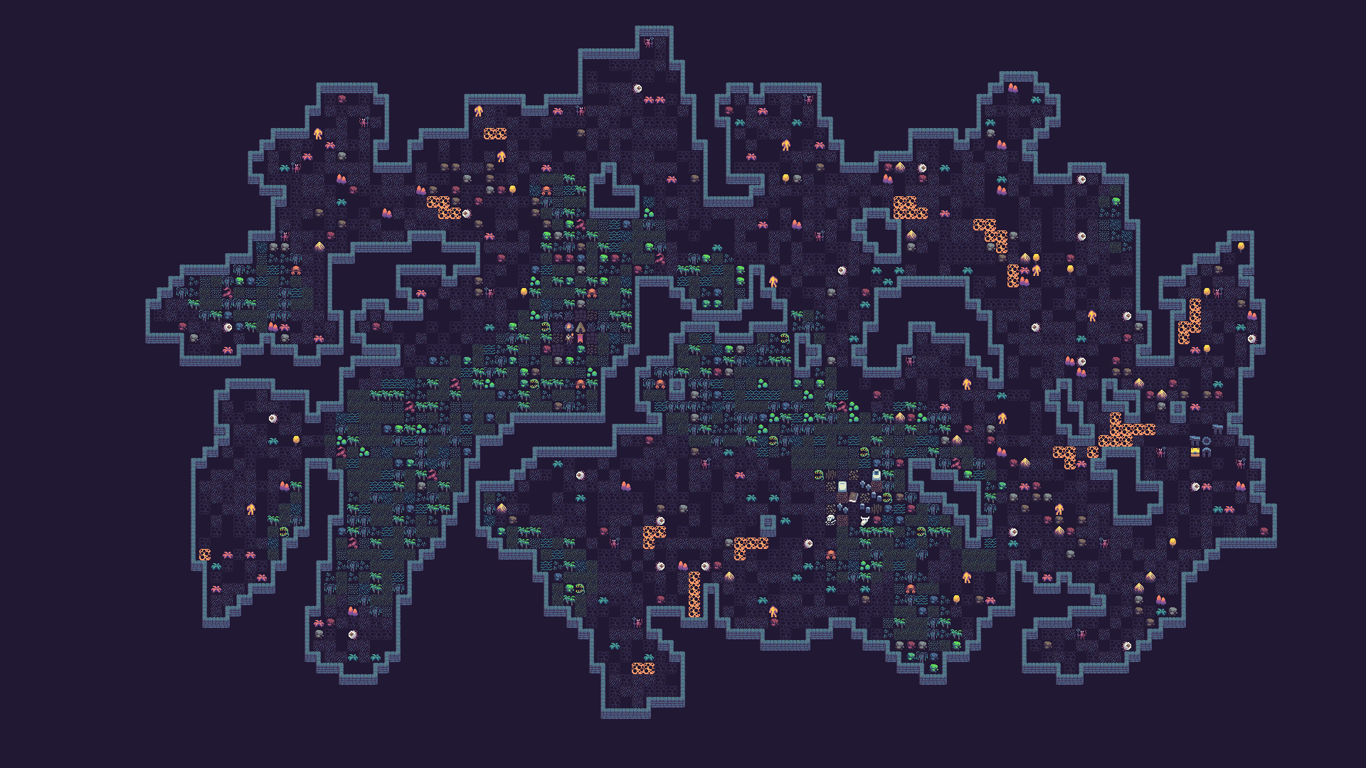Then I thought it could be interesting to add a distinct biome - the Swamp. I used another simplex noise to determine which tiles belong to the Swamp biome, then enabled some Theme rules only when that biome is active.