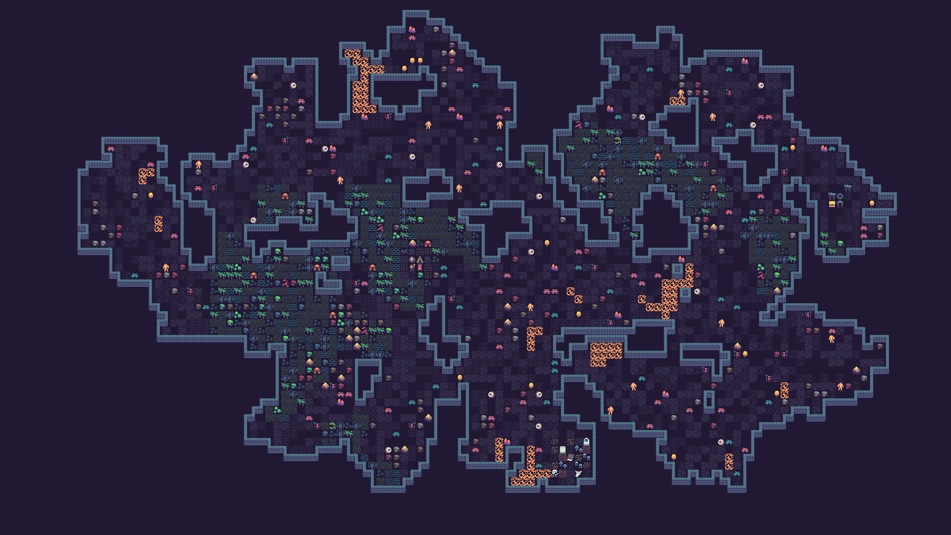 If you're already bored by simplex noise, I have bad news for you! For the lava tiles, I used a combination of two simplex noises. I created one noise specifically for lava placement, but I also didn't want lava appearing too close to the swamp. So a tile only gets a lava tile if the lava noise is high enough and the swamp noise is low - keeping the two biomes from overlapping.